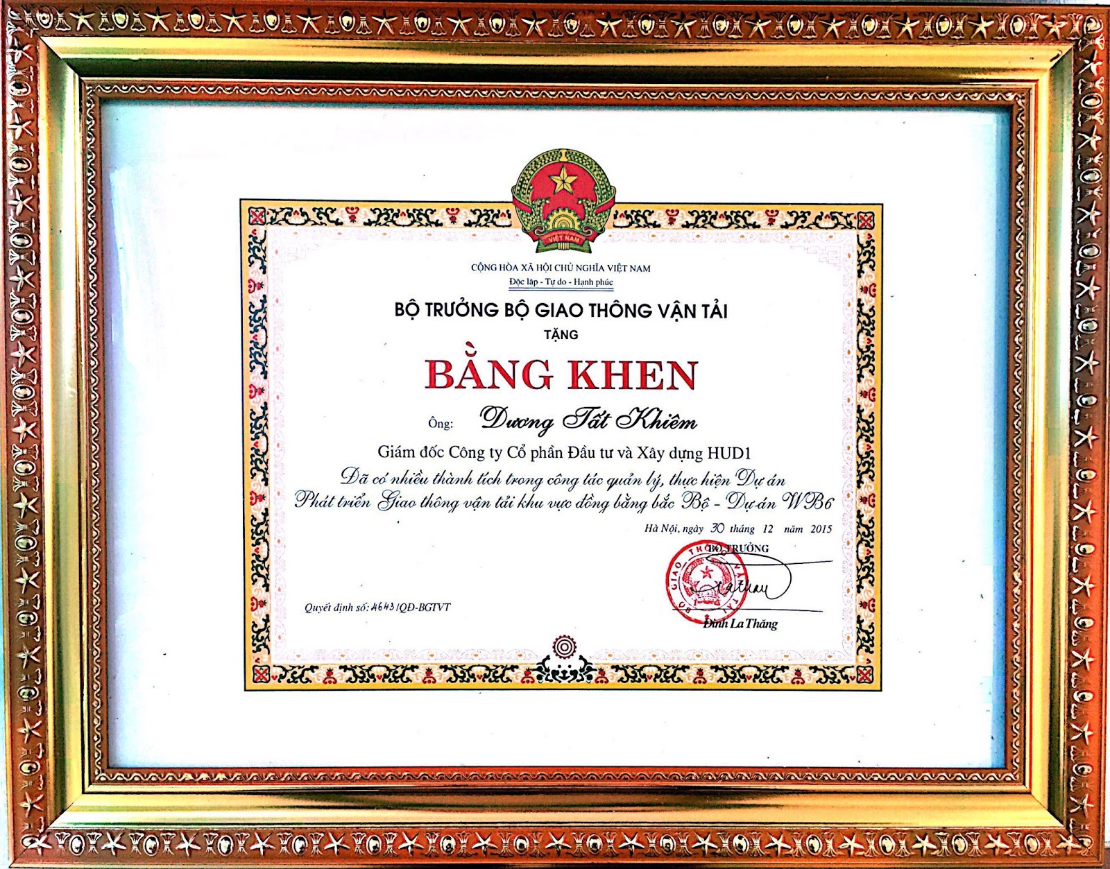 Vừa qua Công ty Cổ phần Đầu tư và Xây dựng HUD1 đã thi công công trình Luồng qua cửa Lạch Giang – Dự án WB6. Theo đề nghị của Cục Trưởng Cục Quản lý Xây dựng và Chất lượng công trình giao thông và Ban quản lý dự án đường thủy. Bộ Trưởng Bộ Giao thông Vận tải đã ra quyết định số 4643/QĐ-BGTVT ngày 30/12/2015 về việc tặng Bằng khen cho ông Dương Tất Khiêm – Giám đốc Công ty Cổ phần Đầu tư và Xây dựng HUD1 đã có nhiều thành tích trong công tác quản lý thực hiện dự án phát triển giao thông vận tải khu vực Đồng Bằng Bắc Bộ – Dự án WB6.